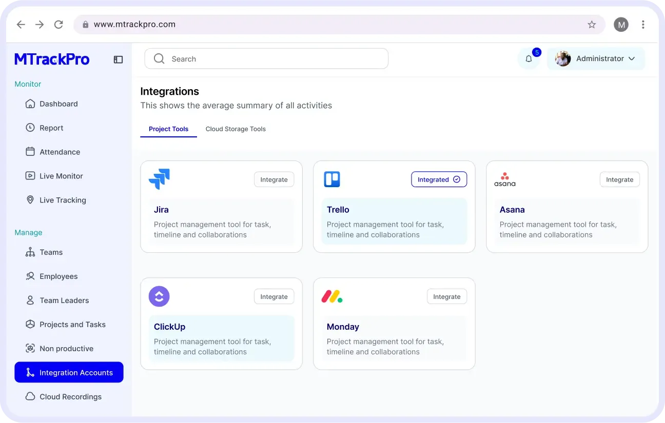 MTrackPro integrates with popular tools like JIRA, Trello, ClickUp, and Monday. Sync tasks and projects for unified visibility and reporting.