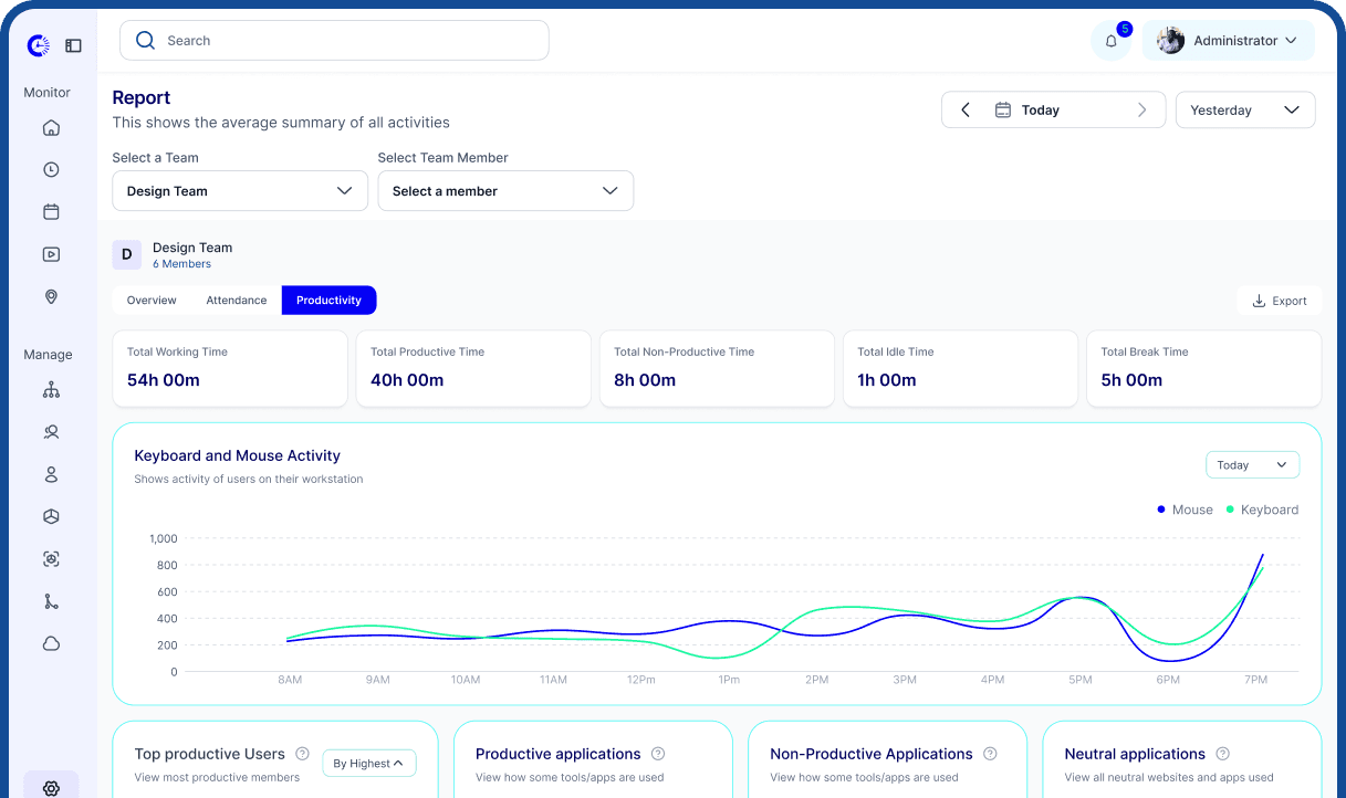Understand how your team utilizes digital tools. Categorize apps and websites as productive or not, and optimize your tool stack.